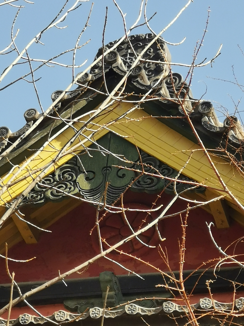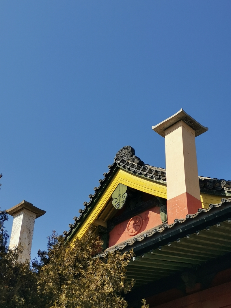 所拍照片里有两张是特写,突出的是房脊处黄色下的木板雕塑,这叫“悬鱼”, 悬鱼,是一种建筑装饰件,位于悬山或歇山建筑两端山面的博风板下,垂于正脊,大多用木板雕制而成。因为最初为鱼形,并从山面顶端悬垂,所以称为“悬鱼”。 东汉时期,权豪之家多尚奢丽,羊续任太守时,有府丞为了与他联络感情,送给他一条名贵的大鱼。 羊续十分为难,他想,如果不收,有可能扫了府丞的面子,况且人家也是一片好意;如果收下呢,又怕别人知道后也来效仿。于是他灵机一动,将鱼收下,但是他不吃也不送人,而是将那条鱼“悬于庭”。