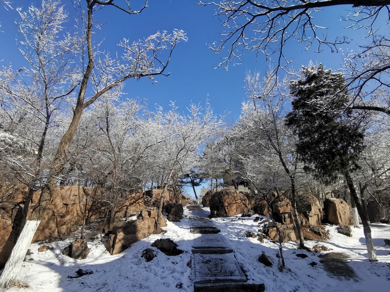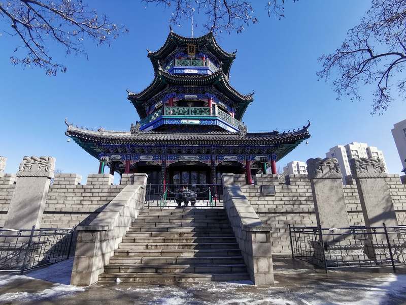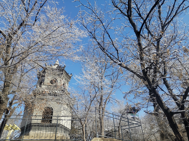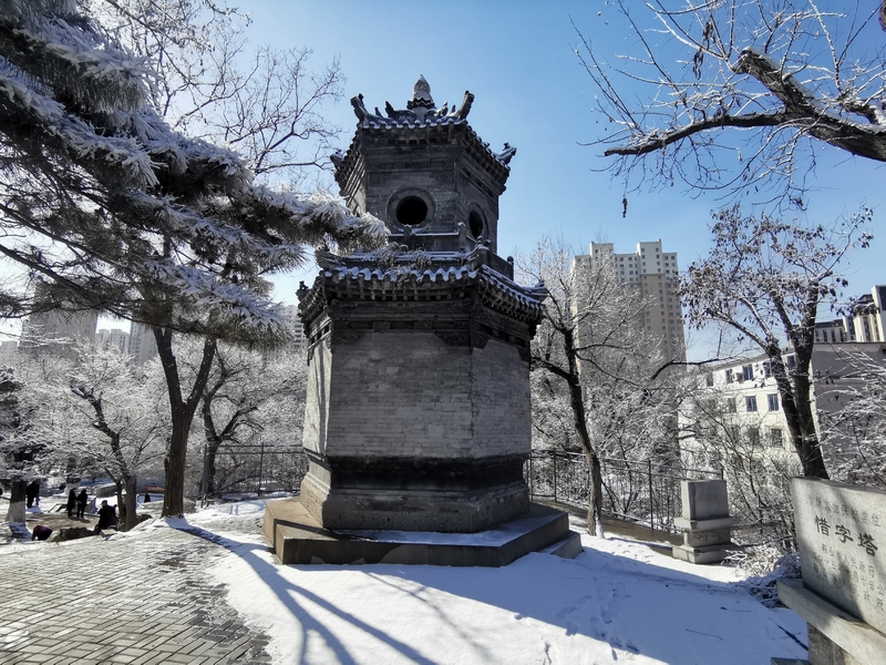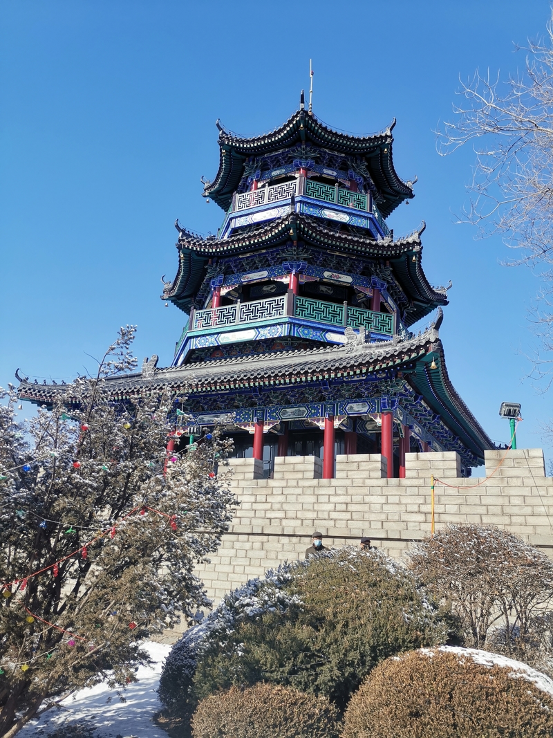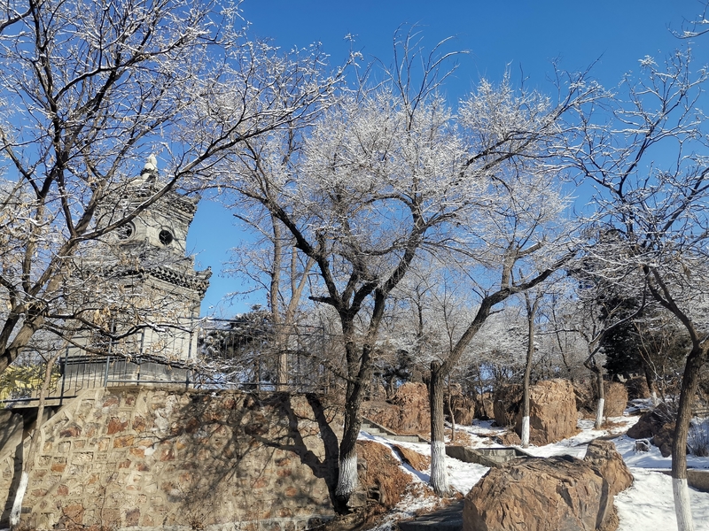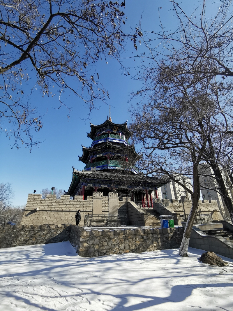 我这高铁下车后公交到达站前先去的厝石山。昨晚一场雪这古迹是美了!正好太阳温暖之时,健身嗮太阳打扑克等等的热热闹闹。这个公园最早可追溯到清朝三十二年,海城知县管风和为了活跃海城人民的文化生活,集资6000两白银修建。公园虽然小了些,但可见那个年代对于休闲生活质量的追求。你看这会市民的热闹汇聚得感谢那个县令了!