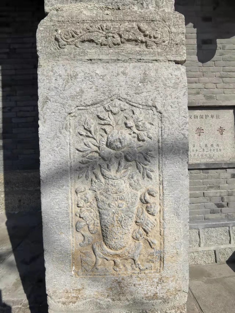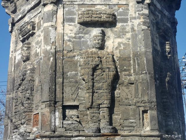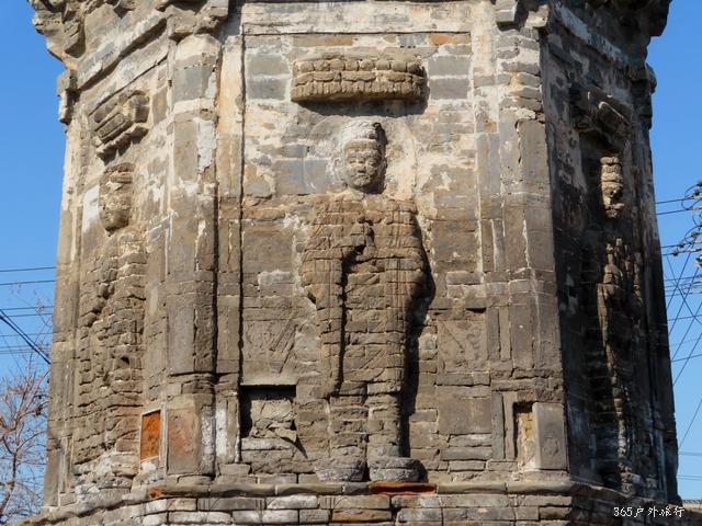民居墙外一块地里穿过去,看到一个小毛道,顺着这小道就到银塔。那几个少年也跟着来了,我又把这给他们介绍,起码让他们了解点家乡的历史。银塔是一座平面六边形九级砖塔,塔身纤细,一层檐下施仿木斗拱,硕大的莲花瓣上,是辽塔典型的一佛二菩萨二飞天加华盖的经典布局。