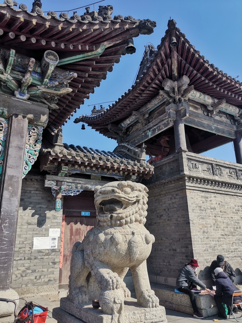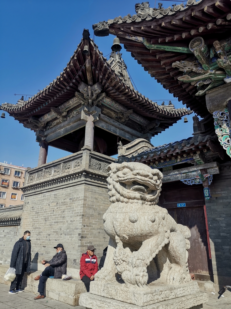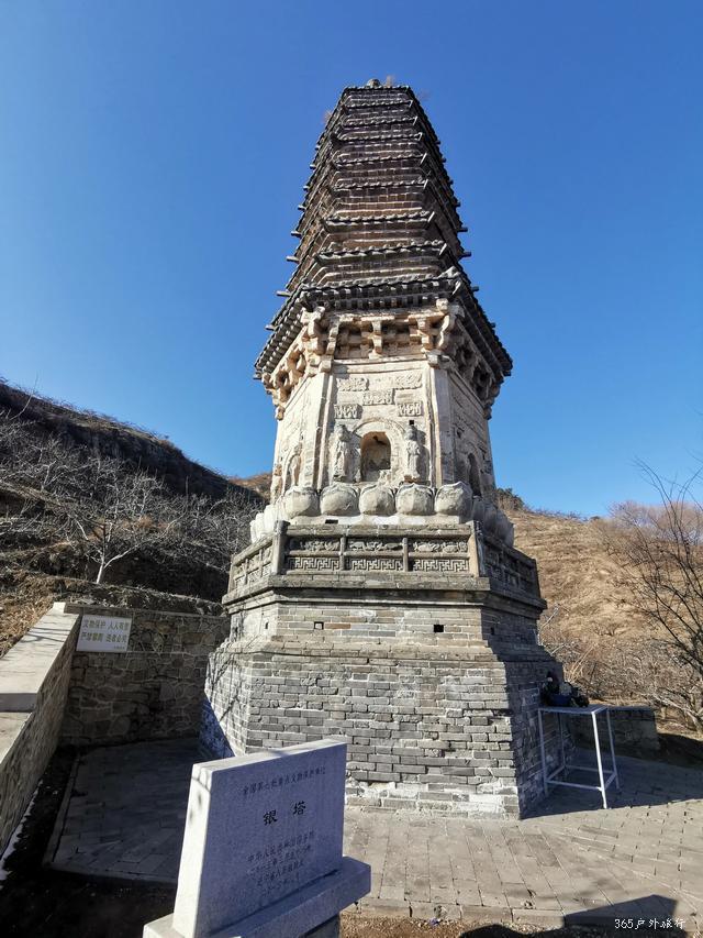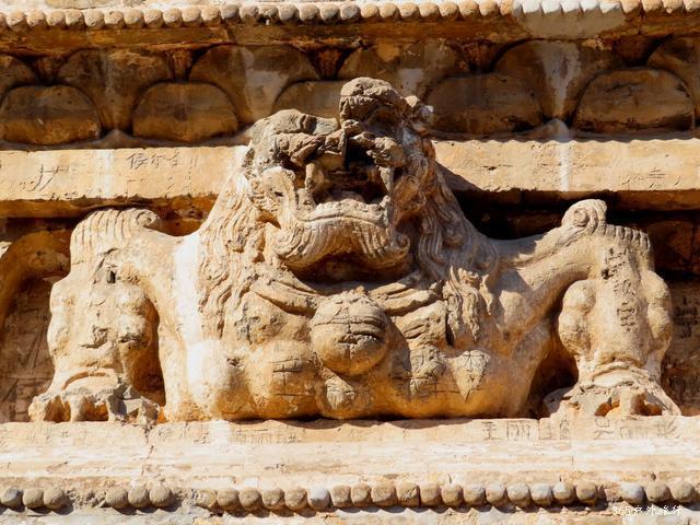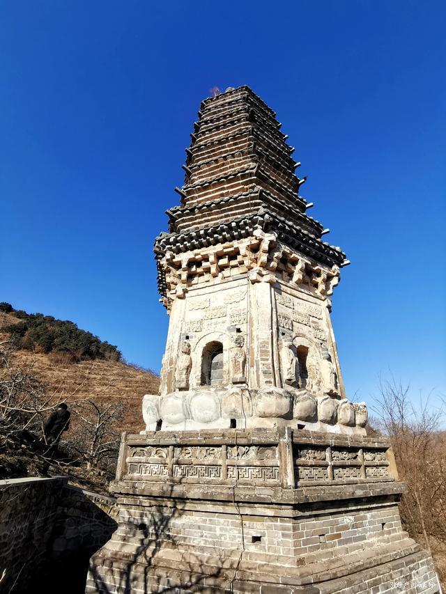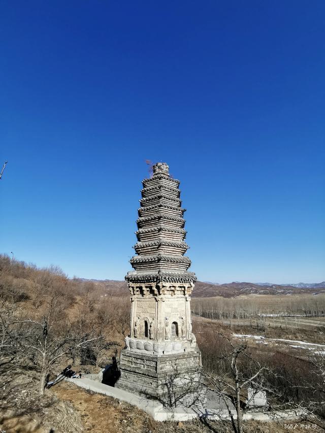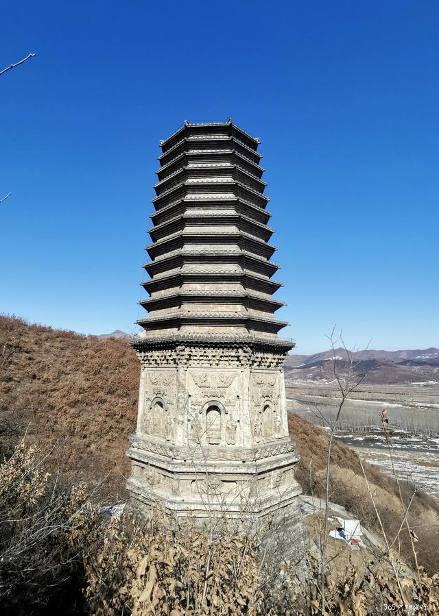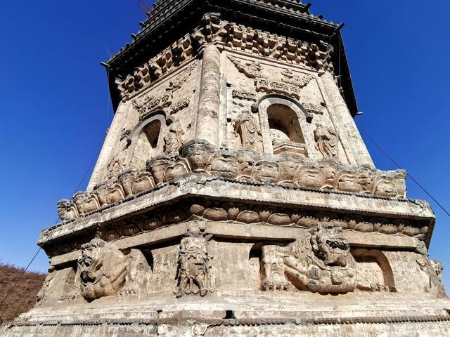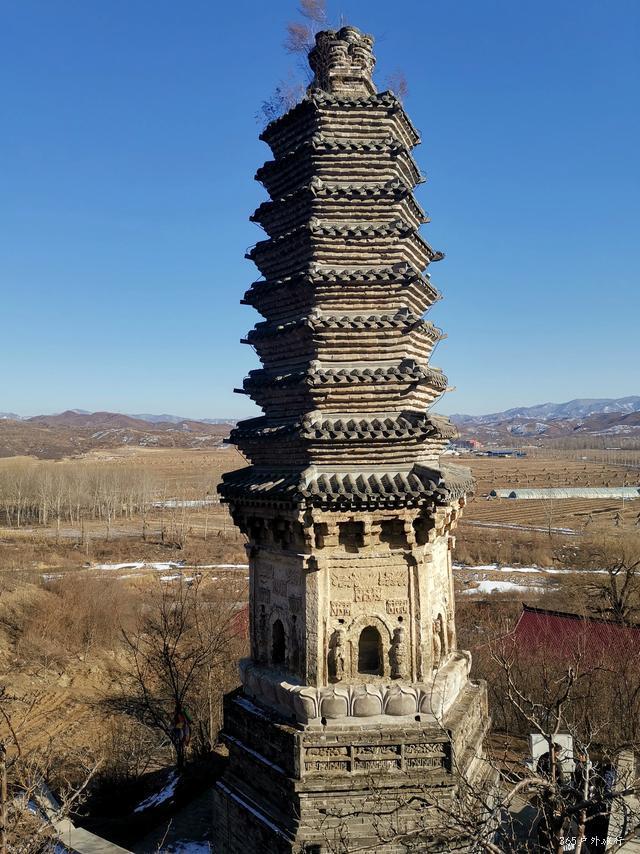 金塔位于镇西五公里左右山峦的半坡上。路并不好走,司机抱怨好几句给钱少了。停在山下,需要徒步上去,原本还为了游览修过路,已经破烂不堪成野路啦。雪后融化泥泞滑溜,得小心翼翼。金塔是一座平面十三级八面密檐式砖塔,最为威武与霸气的,是金塔基座上的雄狮,它们怒目圆瞪,狮口大张,似乎在怒吼着,塔身上有飞天及胁侍人像浮雕,雕刻技艺别致,可谓独具匠心,辽风满满。