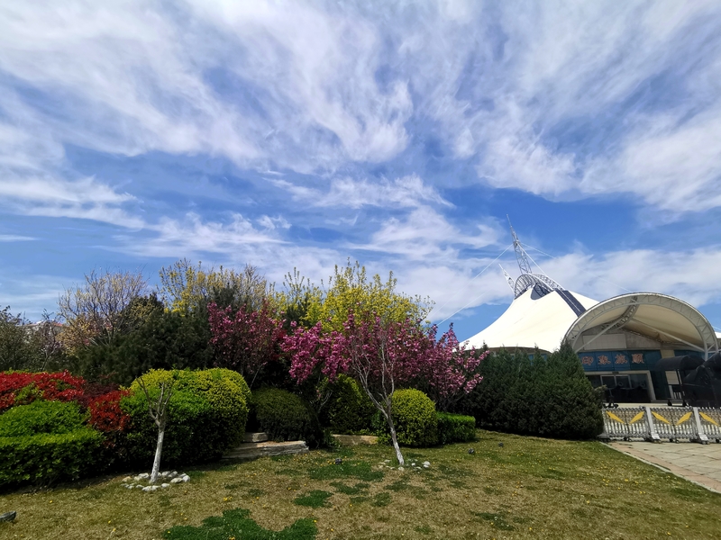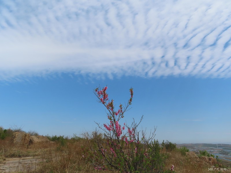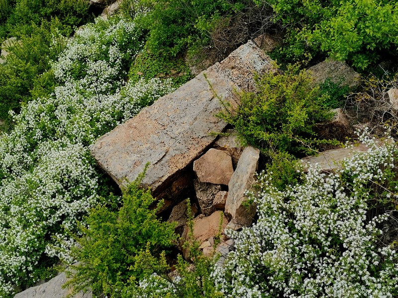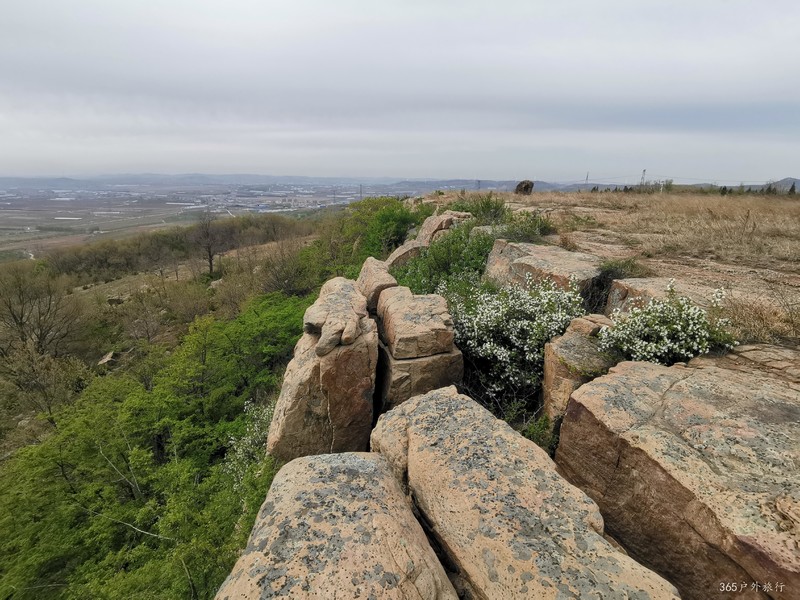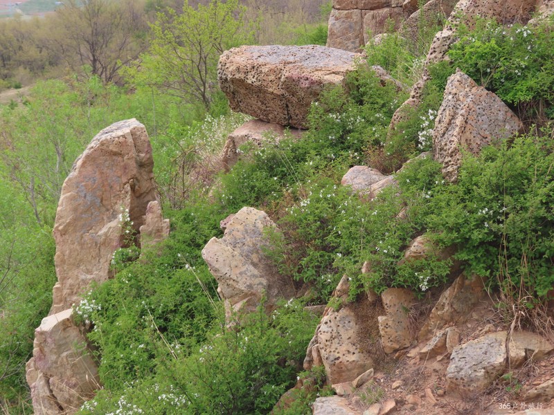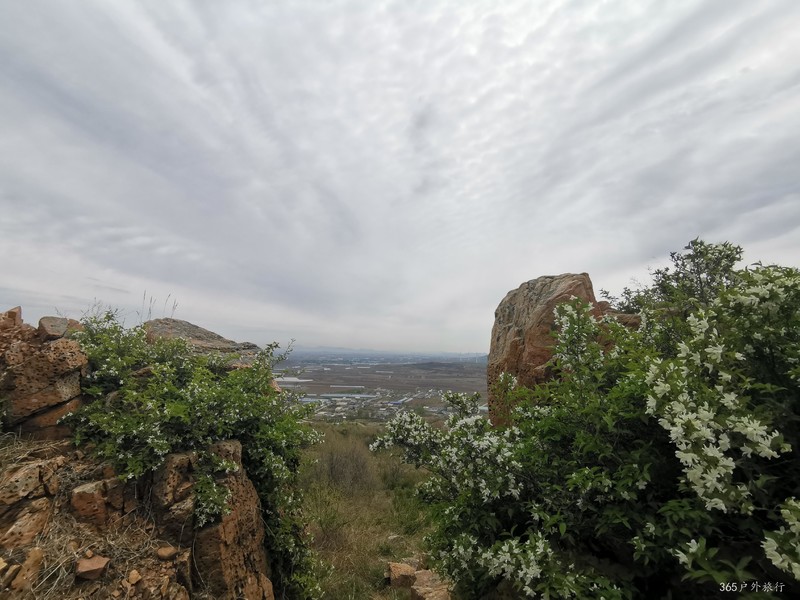幻变的云彩下,一木独秀的桃花分外夭夭,丁香花的浓郁飘荡,白色的野花遍布岩石间,山谷里,你看那“棺材石”被包围其中,颇有意境的季节性场景。每一个地方,每一个画面,都是精彩的大片,队友置身这一个区域玩的不亦乐乎。下山前往海滨途中仰望,光伏基地的西部山崖似乎更为壮观,我们因为这个隔断没有涉足。再查,这个区域应该就是攻略介绍的“西城”“母石坡等景观点,据说更为气势蔚然,极具特色,留点遗憾,下次再来。
