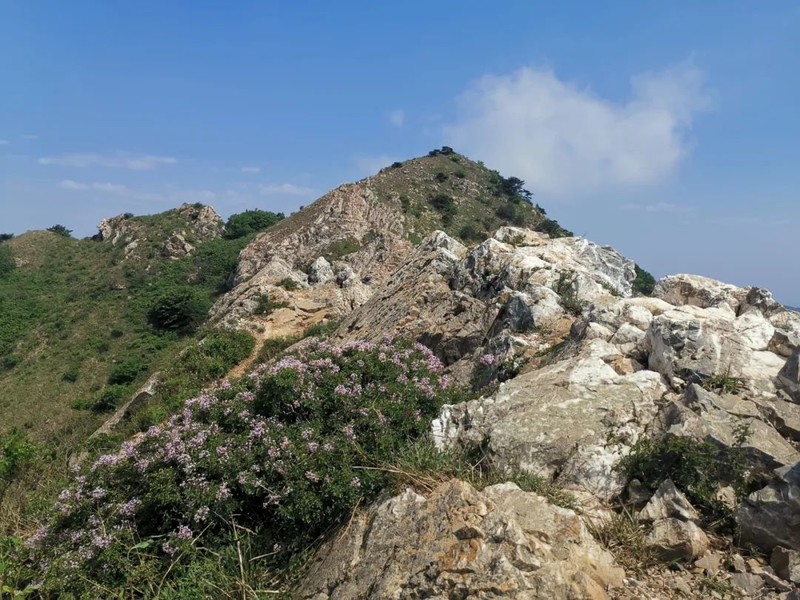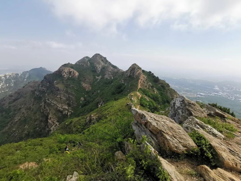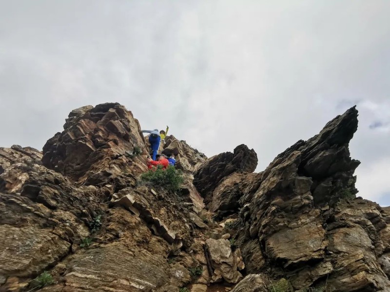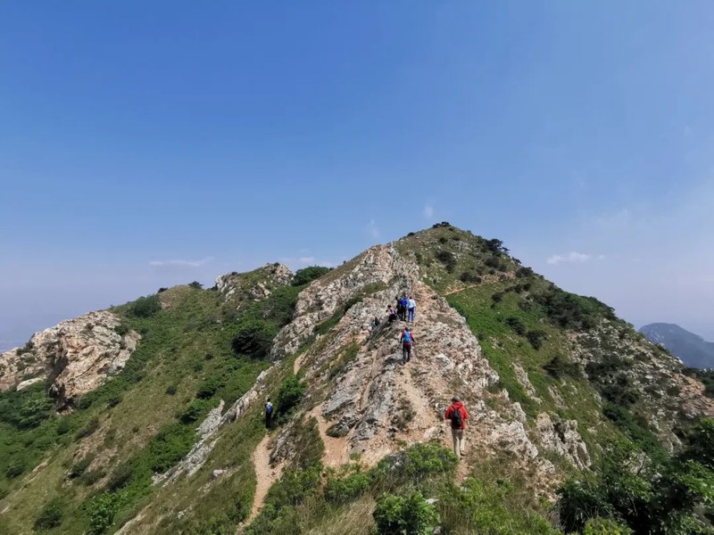 下行到谷底在上山到达“小刀背”。这是对应“大刀背”的称谓。实际上这边的山脊比“大刀背”还要长,可能是惊险程度不及,故给小了一头吧!边上还是有路,队友们还是兴奋在“刀尖上舞蹈”,不过,也是都有自己的安全把握摆拍吧,并不是想象的可以让你“一身冷汗”。