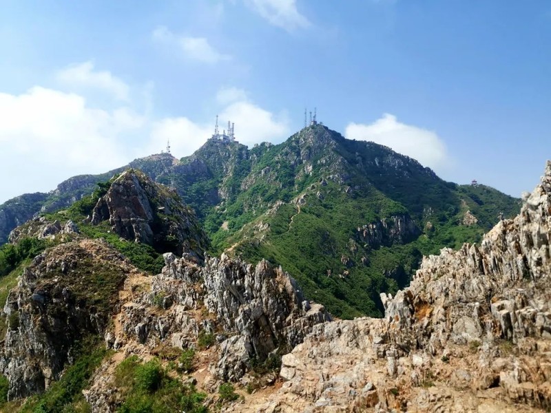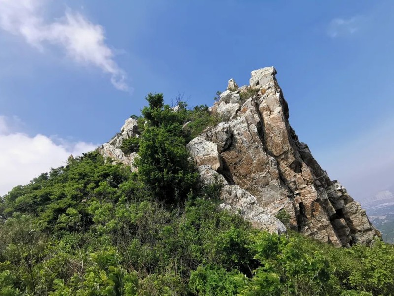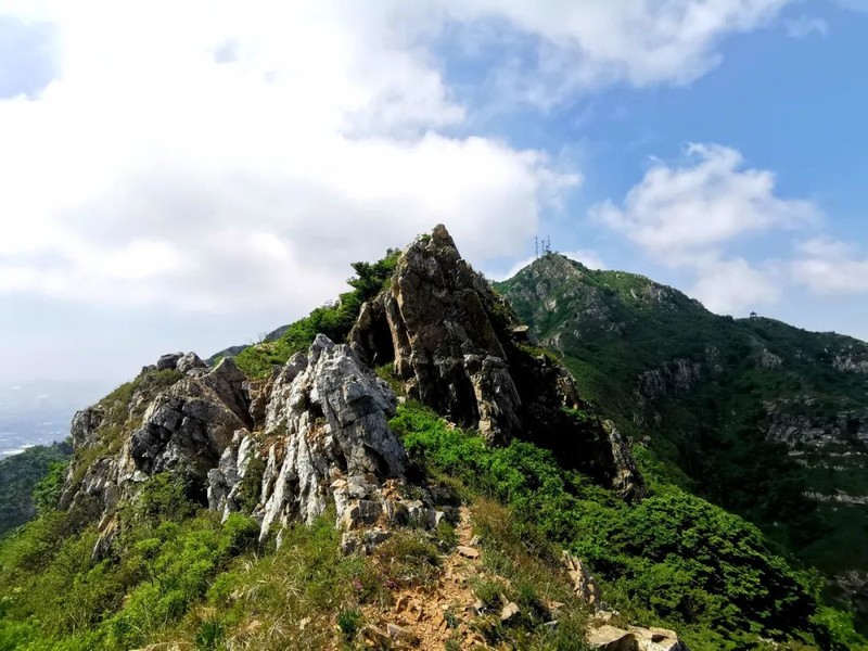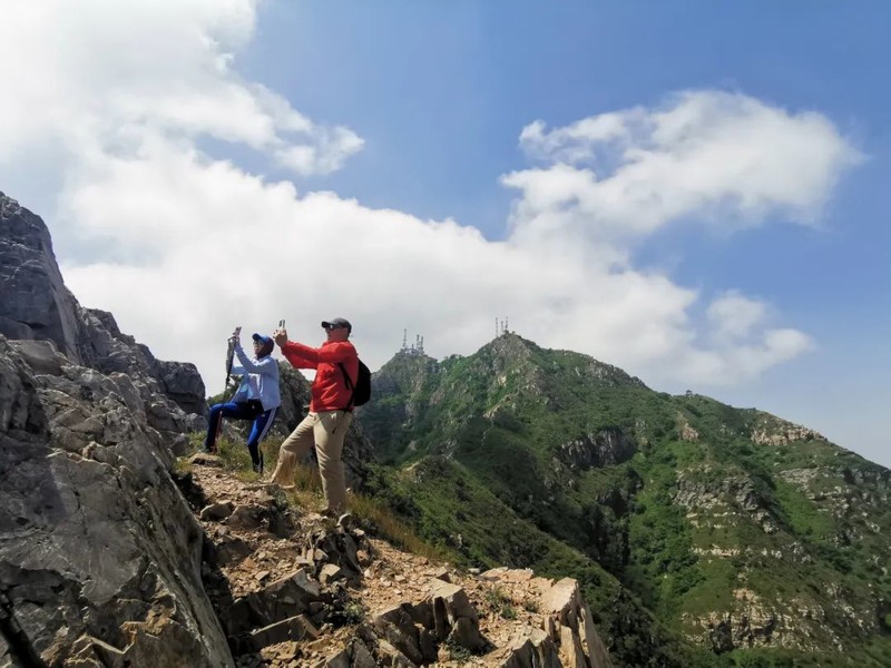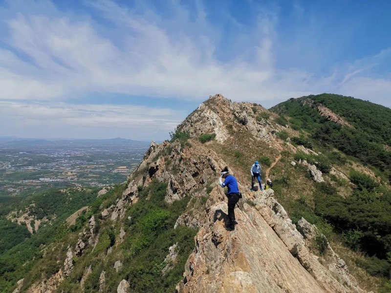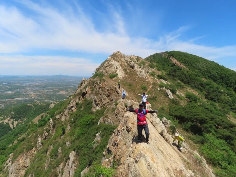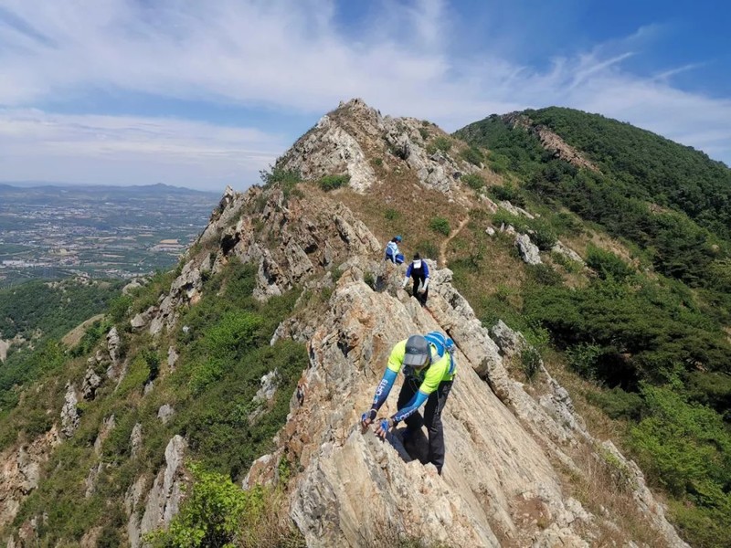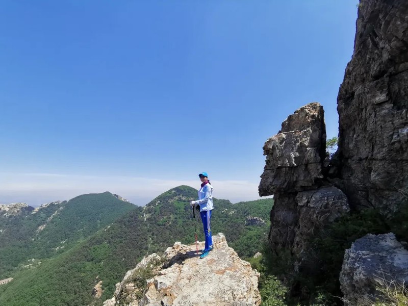 一路在岩石之间上行,顺利到达“杜鹃坡”的观光台。夏风在山间恣意吹拂,清爽无比,曼舞的白云下山峦如黛,此时的大黑山只属于我们的团队,环顾四方,酣畅淋漓。在此左行,蜿蜒的山脊秀出美丽大气的线条,把大黑山装点成绝美的风光大片。这样的场景,我们也是“画龙点睛”般进入这画卷之中,灵动而磅礴!又左切下行奔“猫头鹰岩”。延伸山梁上那些奇形怪状、大小不一的陡峭山岩群分外具有挑战性。路,是需要瞪大眼睛在岩石间仔细寻找,然后发出一声“原来在这里”的感慨。调整各种姿态寻找手脚着力点,或者独立完成,或者队友协作,穿插在峭壁中间,全体顺利安全到达“猫头鹰岩”从正面看,这块石头确实酷似猫头鹰,成像相似的原因在于,头部绝对有神似轮廓,阴影部分如同是猫头鹰的眼睛部位,还真是逼真。下行到谷底在上山到达“小刀背”。这是对应“大刀背”的称谓。实际上这边的山脊比“大刀背”还要长,可能是惊险程度不及,故给小了一头吧!边上还是有路,队友们还是兴奋在“刀尖上舞蹈”,不过,也是都有自己的安全把握摆拍吧,并不是想象的可以让你“一身冷汗”。