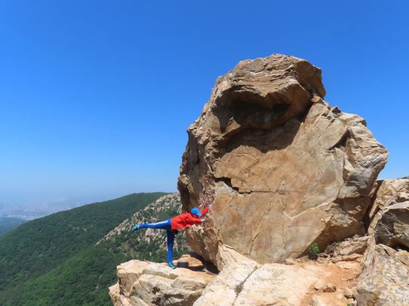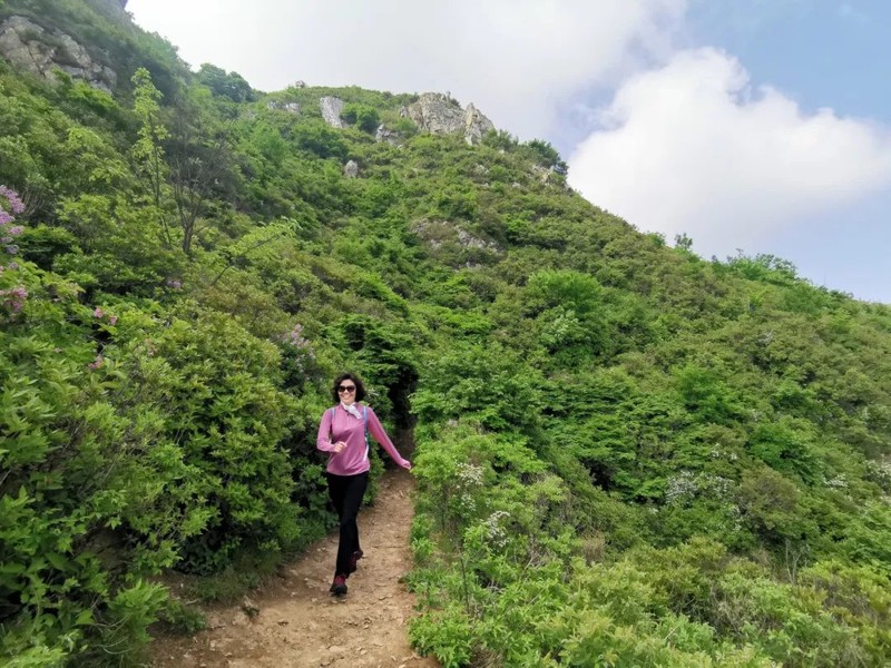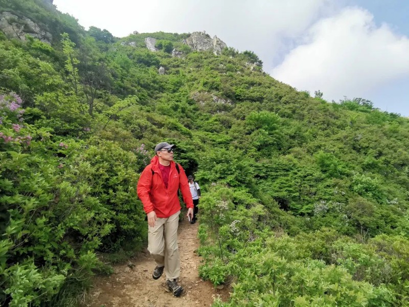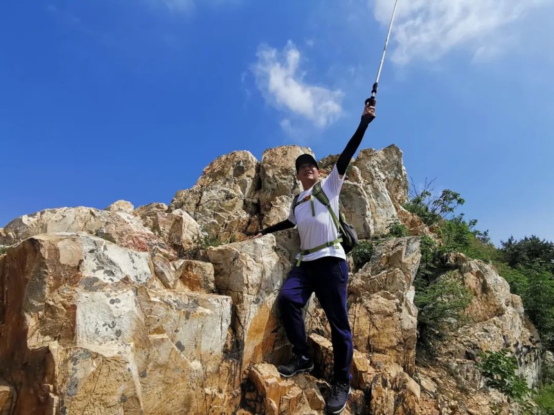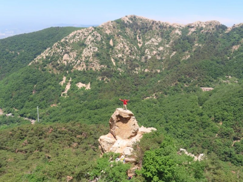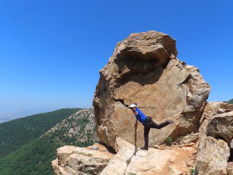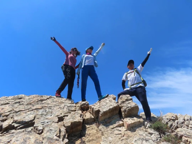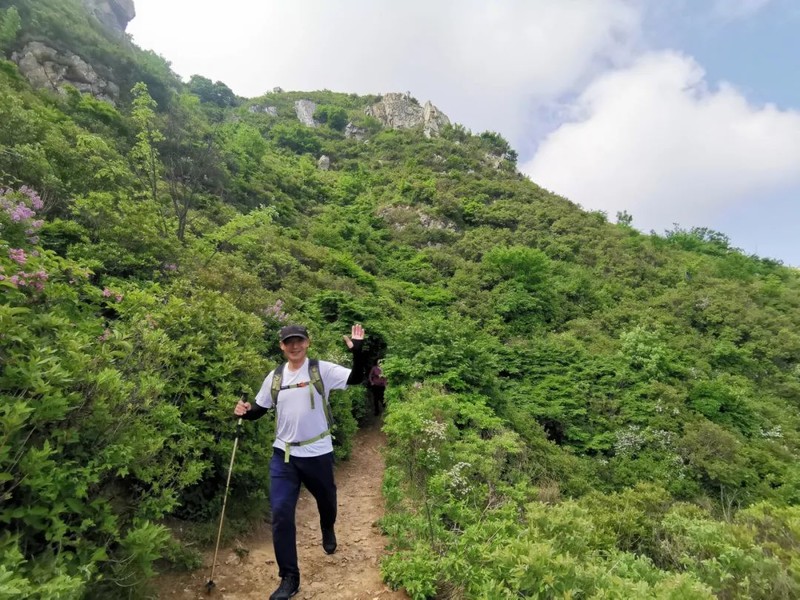 一路在岩石之间上行,顺利到达“杜鹃坡”的观光台。夏风在山间恣意吹拂,清爽无比,曼舞的白云下山峦如黛,此时的大黑山只属于我们的团队,环顾四方,酣畅淋漓。
