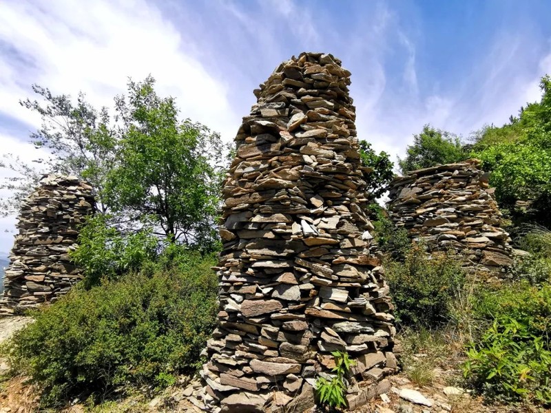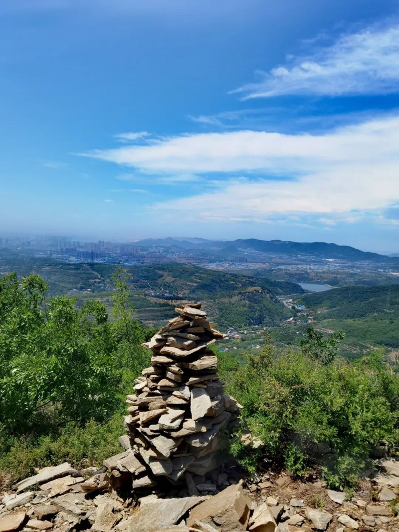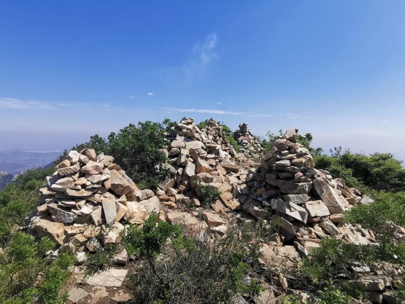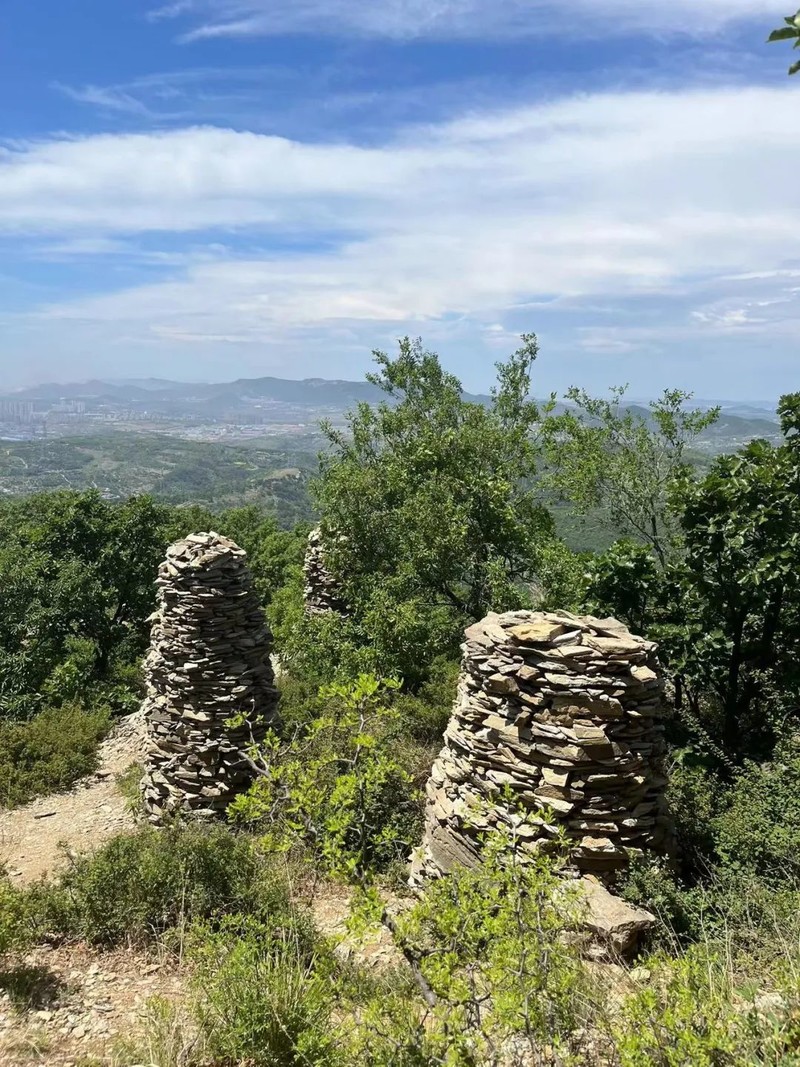 顺利通过,到达“玛尼堆”在小刀背西面下山的途中。有一片破碎的片岩地带,分布大小不等的玛尼堆,大的由数百上千块石片组成,高度超过两米以上。玛尼堆本是藏族地区的宗教文化现象,其意义大体上是代表着一种信仰、追求和祈祷。在大连地区玛尼堆不多见,大黑山这片玛尼堆是什么人、什么时间开始堆放的已不可考,想必是与藏族人和藏传佛教有关,这片玛尼堆已经成为大黑山一景。