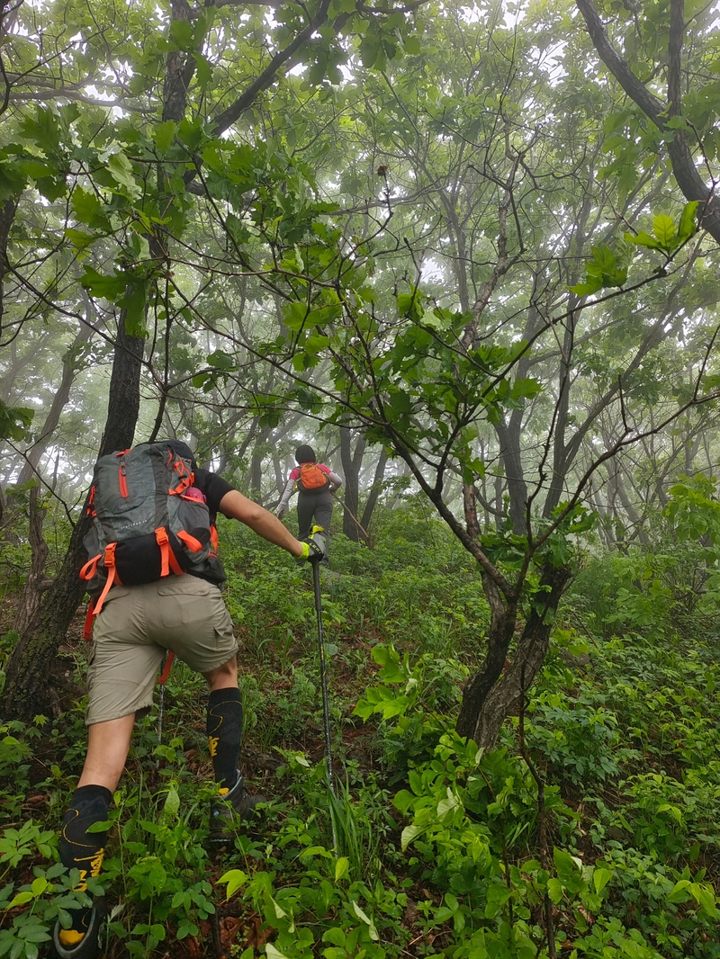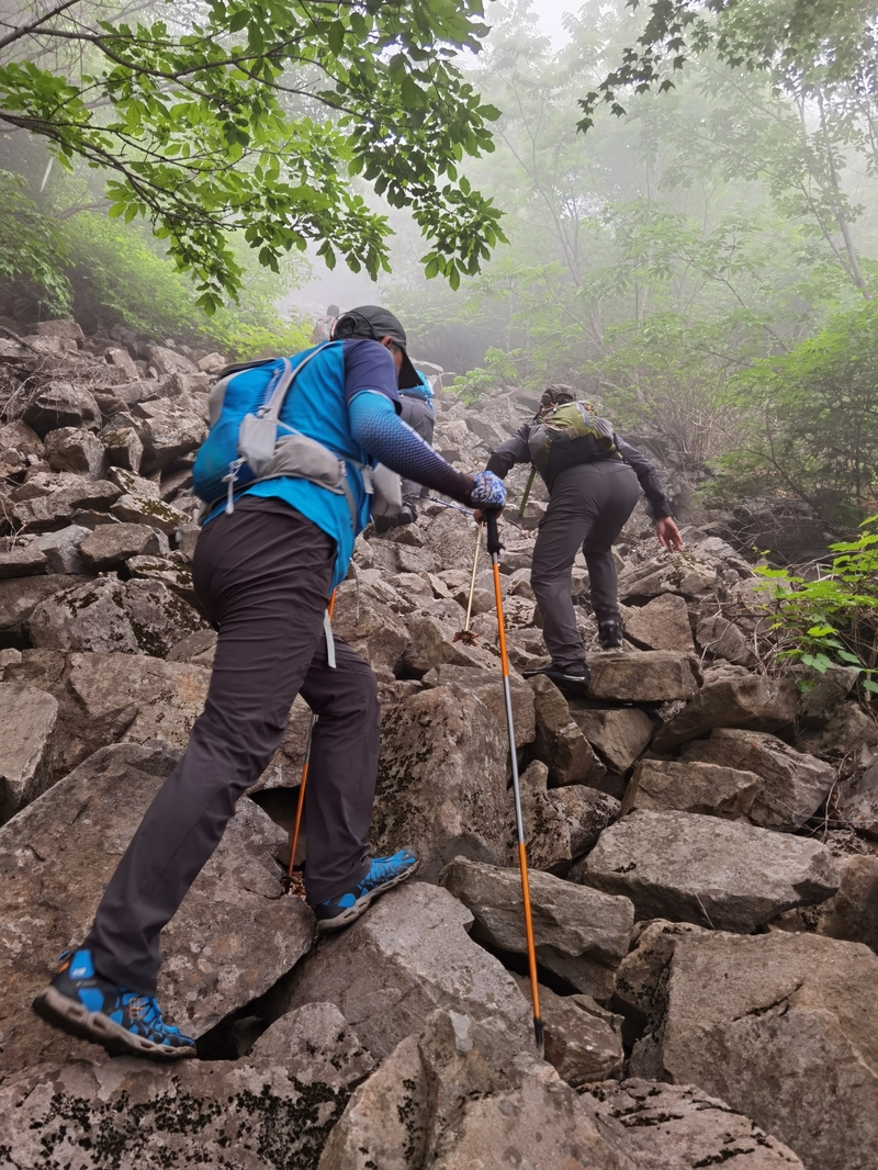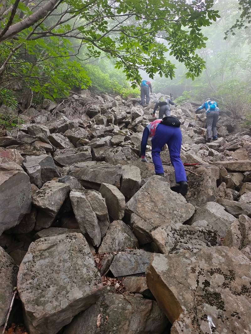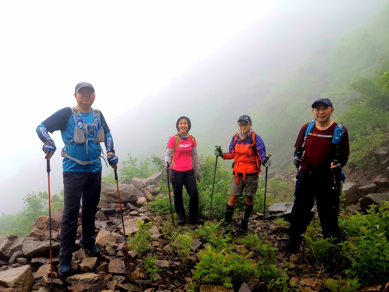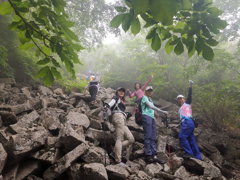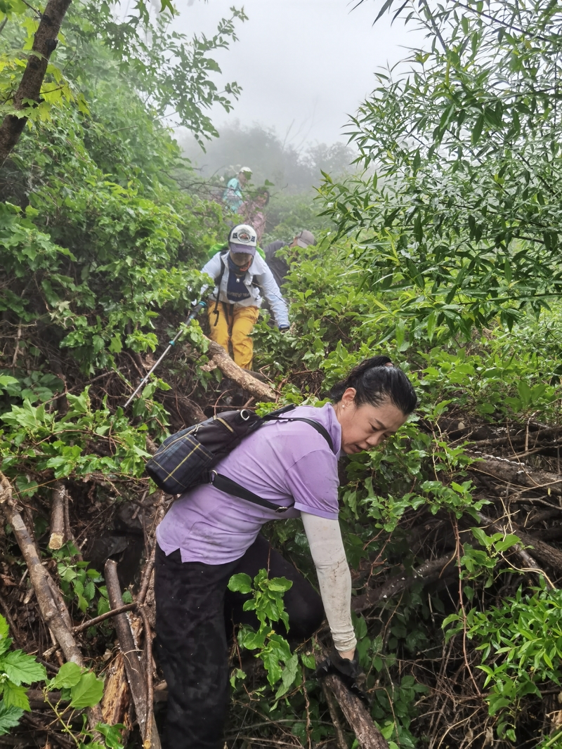 海拔1075米辽南第二高峰老黑山让今天一起穿越的队友见识了什么叫爬山。没有征服的欲望,只是很久没来走走,惦念了。这个端午假期,便把老黑山纳入行程之中。实际上,老黑山的风景指数在辽南并没有太大优势,山路崎岖艰难,对于普通旅游者并无吸引力。能够吸引户外爱好者的元素其一是石海。在老黑山主峰半山坡那几处由巨石汇集而成的巨大石坡,据说事冰河世纪的地质遗址。由于巨石犹如一条大河从山上倾泻而下,所以人们又叫它古石河,也有人称其为“天意石河”。另外,被誉为“植物活化石”的天女木兰也只是这里得特色古老植物之一。属第四纪冰川期幸存的珍贵稀有木本花卉,被列入国家濒危植物名录,对生长环境选择性极强,大多开在海拔千米以上的高峰。这个端午天气阴沉湿润,对于户外运动无疑是个考验。到达位于庄河蓉花山乡小峪村的老黑山脚下仰望,山峰云雾缭绕不见真面。一行13人的队伍面对的即将是一场迷雾中的森林探索。近些年来即使当地人也很少上山,户外穿越队伍为数无几,山上已经没有成熟的路线。所以,对于路况的复杂,心中提前已有考量。雾气笼罩的山中,植被茂密,路况比预想的还要更有难度系数。说是路,其实除了刚开始的部分小毛道以后,就是按照定位方向寻找的极为不明显的野路,我们走过了,便也成了路。路过石海,望去,石河如巨石形成的瀑布,在雾气中越发有天外飞石的神秘感,也蔚为壮观。湿滑中放低身体小心翼翼,一步一块石头。跨过大小三个石海,攀爬岩壁,密林穿插,按计划到达主峰。主峰并无权威海拔标志,应该是之前的登山者在树枝和石头上挂满了jingfan,雾中飘舞,有那么一点神圣感。登顶之后一路下行,这是几年来最严峻的下山体验。初始虽然坡度较陡,枯叶深厚,倒也顺利。继续向下,枯树,藤类植物布满山谷,再次查看轨迹,和之前轨迹查看还是一个路线没错,几次有人走过,再上去观察峡谷两边,比峡谷里面还要茂密无法行走,只能硬着身子创出一条路。过后我和伙伴说“像推土机一样开路”。完全借助身体的向前向下推力压力,在枯树和藤蔓中杀出下山路。甚是脚不触地在树植上“悬空漫步”。还好,只是三百米左右,终于突围,步入消防山路。只有6公里的路程,用时5个多小时,可见路线的难度。有队友戏称这是6星级别穿越。密林、石河、枯叶深坑、峭壁、枯树横亘、藤蔓丛生等等,今天穿越之路太富有户外的各种“障碍设计”,我们的队友又经历一次户外从没有过的淬炼。因在前方探路和开路,自己拍摄照片不多;文中图片多为队友作品。感谢每一位队友的信念坚持和配合,我们同心协力完成本次难度系数较高的户外穿越。【365户外】6月3日大连庄河老黑山穿越