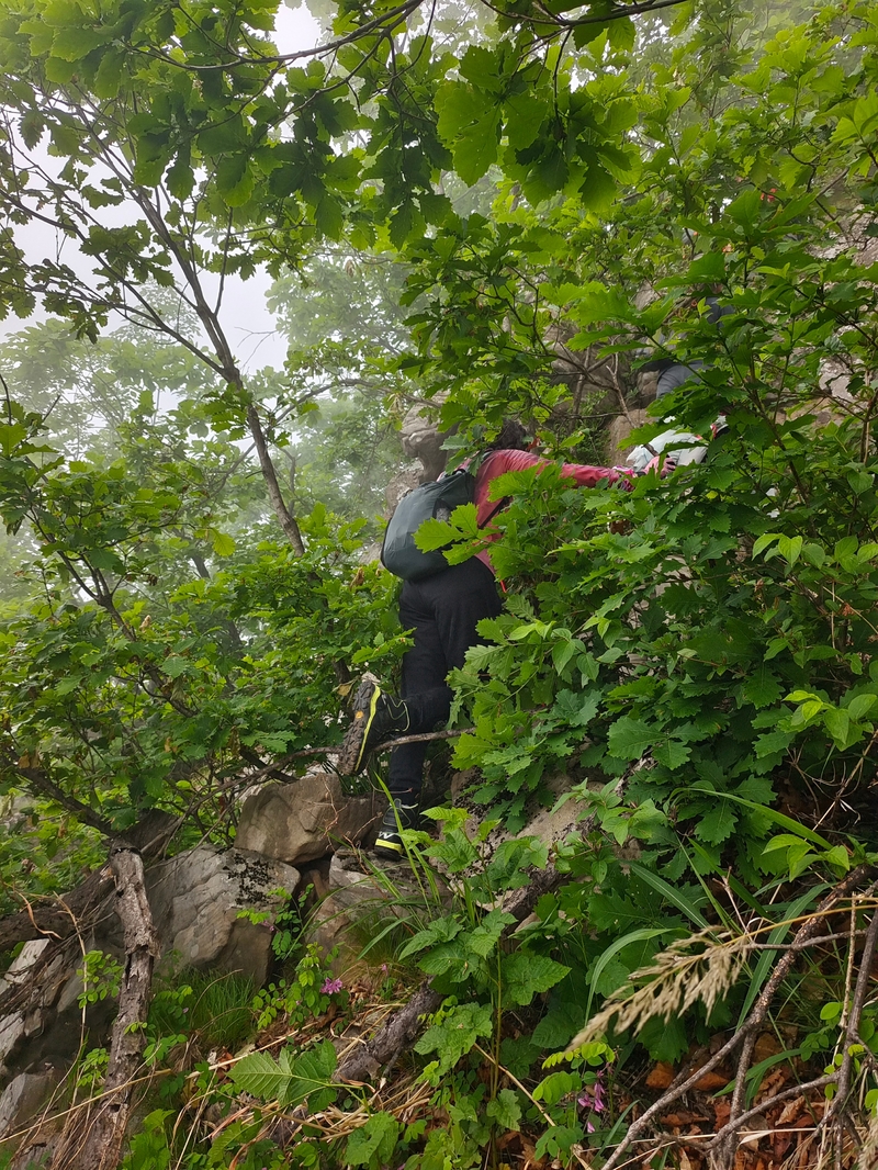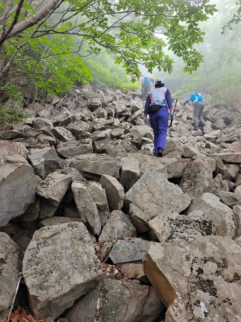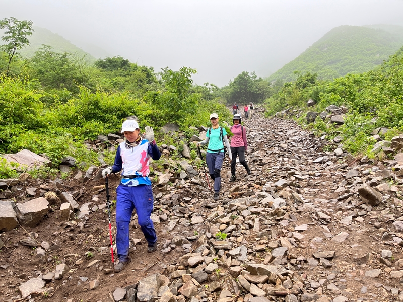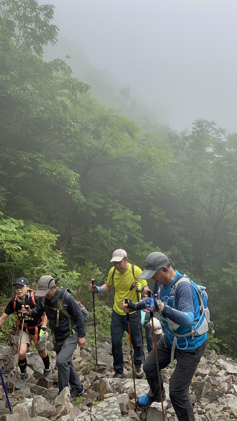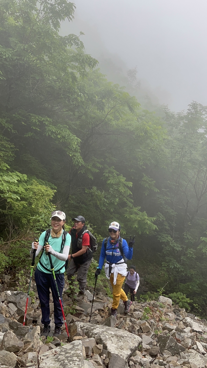 海拔1075米辽南第二高峰老黑山让今天一起穿越的队友见识了什么叫爬山。没有征服的欲望,只是很久没来走走,惦念了。这个端午假期,便把老黑山纳入行程之中。实际上,老黑山的风景指数在辽南并没有太大优势,山路崎岖艰难,对于普通旅游者并无吸引力。能够吸引户外爱好者的元素其一是石海。在老黑山主峰半山坡那几处由巨石汇集而成的巨大石坡,据说事冰河世纪的地质遗址。由于巨石犹如一条大河从山上倾泻而下,所以人们又叫它古石河,也有人称其为“天意石河”。另外,被誉为“植物活化石”的天女木兰也只是这里得特色古老植物之一。属第四纪冰川期幸存的珍贵稀有木本花卉,被列入国家濒危植物名录,对生长环境选择性极强,大多开在海拔千米以上的高峰。这个端午天气阴沉湿润,对于户外运动无疑是个考验。到达位于庄河蓉花山乡小峪村的老黑山脚下仰望,山峰云雾缭绕不见真面。一行13人的队伍面对的即将是一场迷雾中的森林探索。近些年来即使当地人也很少上山,户外穿越队伍为数无几,山上已经没有成熟的路线。所以,对于路况的复杂,心中提前已有考量。雾气笼罩的山中,植被茂密,路况比预想的还要更有难度系数。说是路,其实除了刚开始的部分小毛道以后,就是按照定位方向寻找的极为不明显的野路,我们走过了,便也成了路。路过石海,望去,石河如巨石形成的瀑布,在雾气中越发有天外飞石的神秘感,也蔚为壮观。湿滑中放低身体小心翼翼,一步一块石头。跨过大小三个石海,攀爬岩壁,密林穿插,按计划到达主峰。主峰并无权威海拔标志,应该是之前的登山者在树枝和石头上挂满了jingfan,雾中飘舞,有那么一点神圣感。登顶之后一路下行,这是几年来最严峻的下山体验。初始虽然坡度较陡,枯叶深厚,倒也顺利。继续向下,枯树,藤类植物布满山谷,再次查看轨迹,和之前轨迹查看还是一个路线没错,几次有人走过,再上去观察峡谷两边,比峡谷里面还要茂密无法行走,只能硬着身子创出一条路。过后我和伙伴说“像推土机一样开路”。完全借助身体的向前向下推力压力,在枯树和藤蔓中杀出下山路。甚是脚不触地在树植上“悬空漫步”。还好,只是三百米左右,终于突围,步入消防山路。只有6公里的路程,用时5个多小时,可见路线的难度。有队友戏称这是6星级别穿越。密林、石河、枯叶深坑、峭壁、枯树横亘、藤蔓丛生等等,今天穿越之路太富有户外的各种“障碍设计”,我们的队友又经历一次户外从没有过的淬炼。因在前方探路和开路,自己拍摄照片不多;文中图片多为队友作品。感谢每一位队友的信念坚持和配合,我们同心协力完成本次难度系数较高的户外穿越。【365户外】6月3日大连庄河老黑山穿越