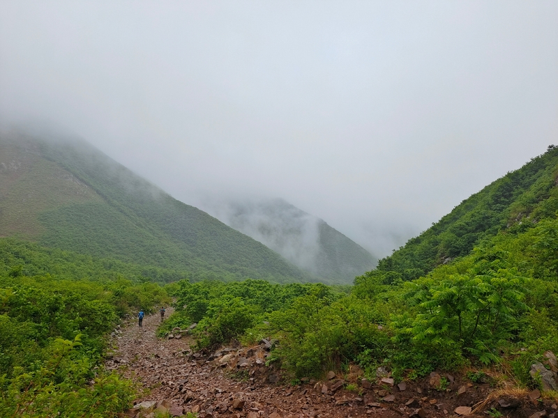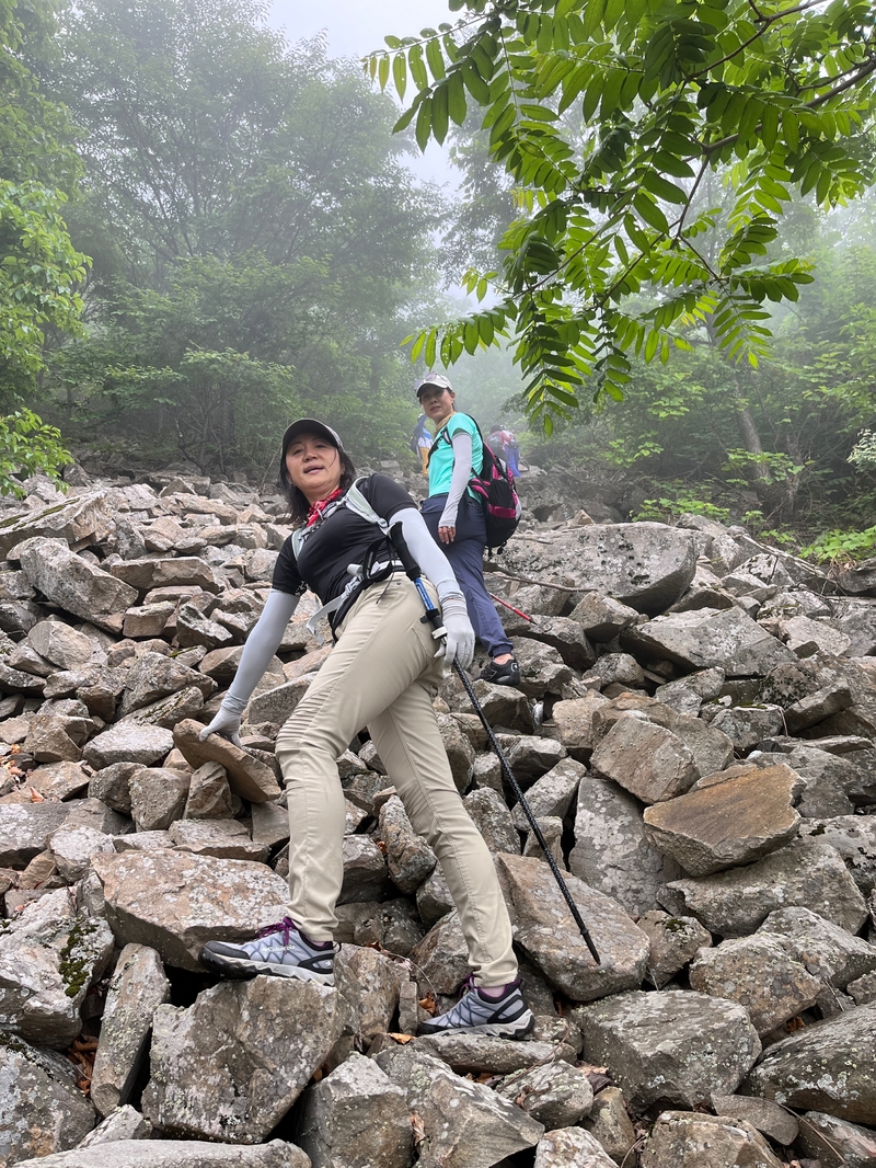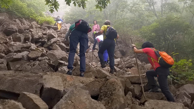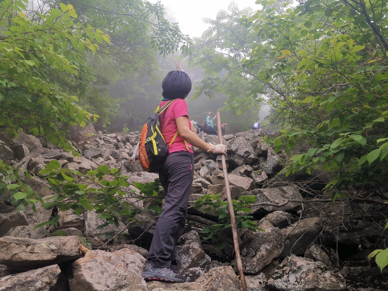 雾气笼罩的山中,植被茂密,路况比预想的还要更有难度系数。说是路,其实除了刚开始的部分小毛道以后,就是按照定位方向寻找的极为不明显的野路,我们走过了,便也成了路。路过石海,望去,石河如巨石形成的瀑布,在雾气中越发有天外飞石的神秘感,也蔚为壮观。