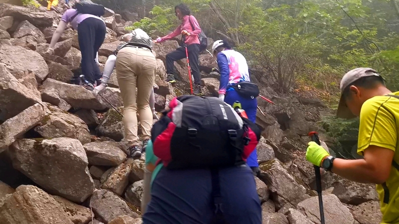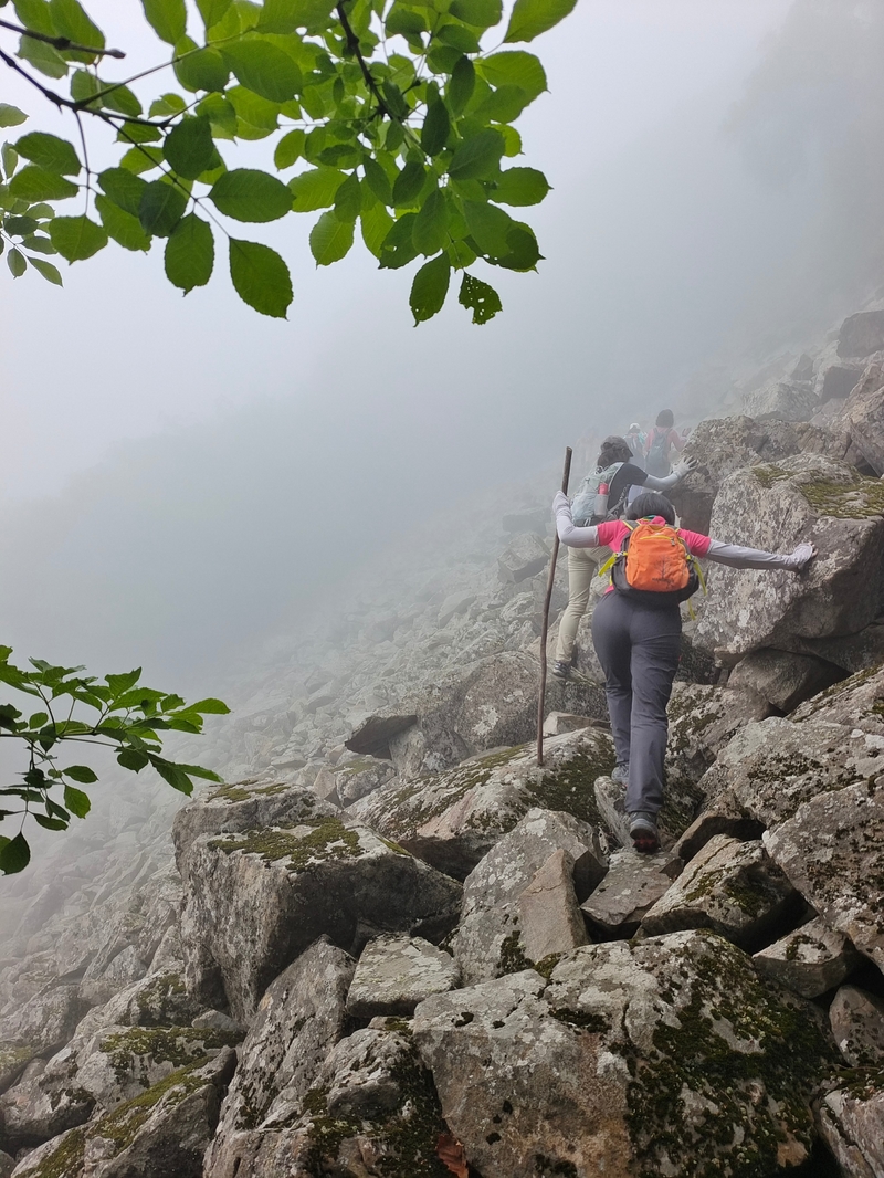 湿滑中放低身体小心翼翼,一步一块石头。跨过大小三个石海,攀爬岩壁,密林穿插,按计划到达主峰。主峰并无权威海拔标志,应该是之前的登山者在树枝和石头上挂满了jingfan,雾中飘舞,有那么一点神圣感。