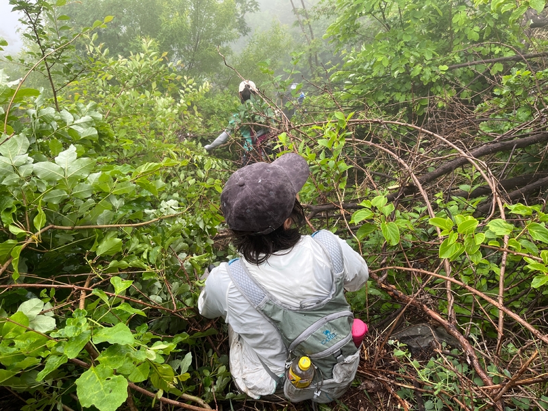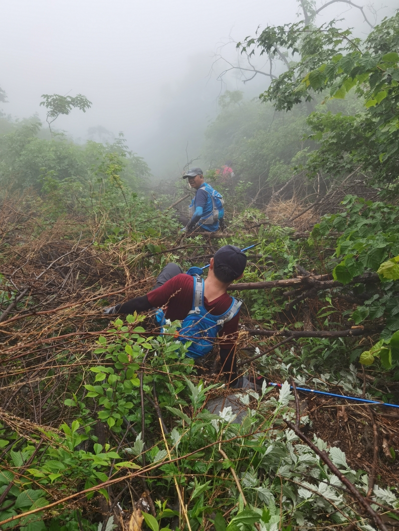 过后我和伙伴说“像推土机一样开路”。完全借助身体的向前向下推力压力,在枯树和藤蔓中杀出下山路。甚是脚不触地在树植上“悬空漫步”。还好,只是三百米左右,终于突围,步入消防山路。