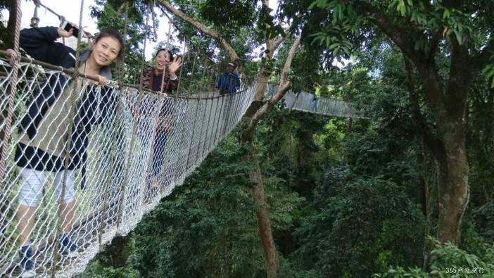 望天树“空中走廊”,全长约500米,高约20米,穿行于高大的望天树树冠之间,这是我国第一条树冠走廊。