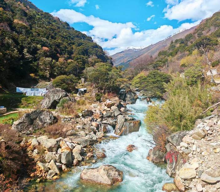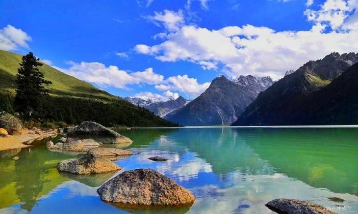 从甘孜县前往德格,首访玉龙拉措,又名 “新路海”,由雀儿山冰川融水滋养而成,湖水呈梦幻蓝绿色,湖畔野花遍地,雪山倒映湖面,宛如藏地秘境中的仙境。